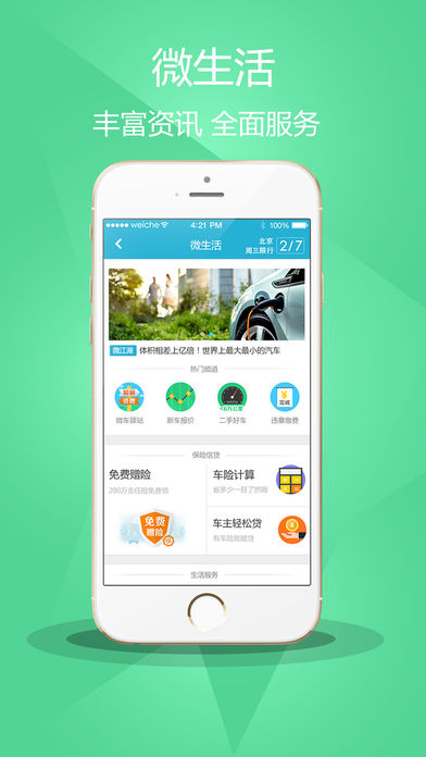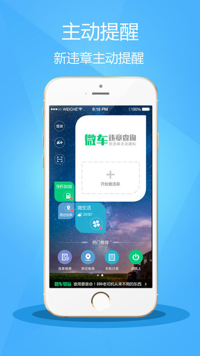 中国最好的车主服务APP 免费支持全国车辆违章查询300+城市,违章主动提醒,快速稳定 在线违章缴费、9折加油、车辆买卖等全方位用车服务。 -------优势功能------- 【主动提醒】违章查询、尾号限行、摇号结果,最新动态主动提醒 【九折加油】新增九折加油”功能,每升最高直降一元(仅限华北地区合作油站) 【车主服务】违章缴费、二手车买卖、汽车代驾保养、车主贷款,一键下单 【贴条地图】告诉你具体路段贴条风险,从此和违章停车说88 其他功能简介: √ 云端绑定:违章数据全保存,历史记录随时查 √ 违章预警:高发违章点、新增违章点重点预警 √ 我的钱包:账户余额、优惠券、交易记录一目了然 √ 天气指数:熟知每日天气温度、洗车指数 √ 销分、年检提醒:及时智能销分提醒、年检提醒 √ 个性背景:更多定制酷车主题、设计师精心设计的封面 √ 周边生活:快速锁定加油站、停车场、摄像头等车主关注地 √ 多车多城:同时查询多台车辆,多个城市的违章数据 【我们寄语】 用户群:257034393 合作服务: bdgroup@weiche.cn 我们不会停止对产品的热忱、对完美的追求!点点滴滴的优化,都为了给你最好的体验。如果在使用中有任何问题或者建议,欢迎联系反馈。 -----------------------