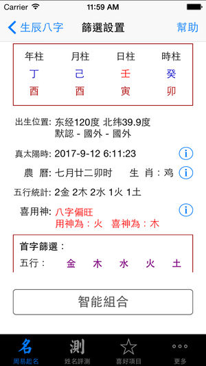 周易起名是基于中国传统周易理论, 综合生辰八字喜用神、三才五格笔画、生肖喜忌、字形、音义等开发的专业起名辅助App。 * 专业八字测算、汉字音律、意义、字形等解释 *支持大陆简体及台湾、香港、澳门等地区的繁体语言 * 采用真太阳时作为推算八字基础,准确判断八字格局 * 汉字笔画及五行属性以《康熙字典》为标准 * 一键轻松生成 * 好名收藏功能。 简单一键加入收藏夹, 可供随时查阅