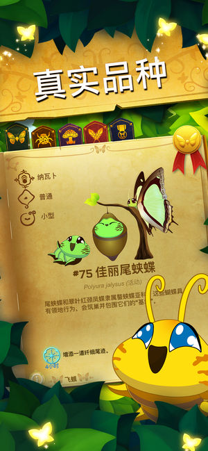 最美的蝴蝶游戏!打理美丽的热带雨林,收集、喂养和培育蝴蝶,观赏它们璀璨的一生。300多个可供收集的品种! 每一只蝴蝶都对应现实生活中的品种,它们拥有美丽的翅膀花纹和独一无二的行为特征。收集各种各样的艳丽花朵,吸引新品种的蝴蝶。从蝶蛹、毛虫到蝴蝶,这些可爱的生物需要你的帮助来茁壮成长! 收集挑战 看看你能不能集齐大量现实生活中的蝴蝶品种! 美丽的亚马逊雨林 通过收集和种植特别的鲜花来吸引新品种的蝴蝶,用新的生物和色彩不断拓展你的森林。 真实的品种 收集世界各地的蝴蝶并将它们加入到你的《蝴蝶百科》。每个品种都设有独一无二的小知识页面,介绍了它们的特征和自然历史。