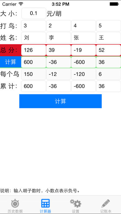 放炮罚,又称为百胡,红胡,告胡子,煨胡子,跑胡子。是湖南娄底及其周边地区流行的一项字牌类游戏,据说该种字牌起源于湖南省双峰县,所以又有双峰跑胡子的说法。该游戏需要在某玩家的胡子数超过一百胡时进行一次计算。该软件是一款辅助计算的软件。计算快捷,且计算结果准确无误。 您可以使用本软件来计算结果,也可以直接使用本软件来记录胡子。使用本软件记录胡子的话,您不再需要笔记来进行记录,软件将自动把结果计算出来,并将每一局各玩家的最终胡子数,结果数,累计输赢值记录到历史数据中。 本软件支持如下功能: 1,有人打鸟,有人打多个鸟,有人打拖鸟,在打多个鸟的时候,可以设置软件显示每个鸟进出多少钱。 2,软件自动记录累计输赢值。(当重复计算时,软件将不会再次将该结果值加入到累计值中) 3,可设置“操作时播放语音”,让您的输入更加准确无误。并且软件在计算后,将自动播报各玩家的计算结果。 4,逐盘添加。使用该功能后,您将不再需要使用笔纸来记录。 5,屏幕常亮。使用该功能后,手机屏幕将一直处于常亮状态。 6,支持三人版。四个人玩的时候可以使用本软件,三个人玩时也同样可以使用本软件。 7,记账本功能,使用该功能后,您可以清楚知道自己每年,每月都输赢了多少钱。