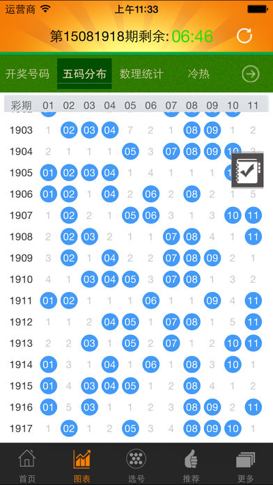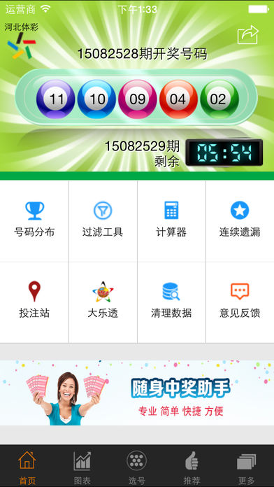 河北体彩11选5彩票专业工具,各种图表助您选出最佳号码。通过开奖号码图表,发现出号规律,是您中奖的好帮手。 - 囊括开奖走势、遗漏、冷热、奇偶、码型、号码分布等图表。 - 专业投注号码推荐,助你跟踪决策。 - 彩票专家教你选号投注的秘密技巧。 - 还有大乐透,排列三,排列五,七星彩开奖查询。 - 只需极少流量,没有网络也可查看历史图表。