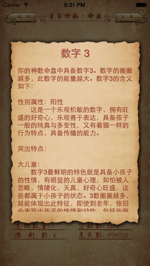 星言神数绝对是你不容错过的最佳读心术! 了解你自己;了解你的另一半;了解你的老板、上司、同事或下属;了解你的客户并加深同客户的感情;了解每一个你正在交往或准备交往的人…… 史上最具神秘色彩的动画效果,独一无二的神秘解析,让你身临神秘学神奇的知识海洋里无法自拔。 星言神数是与国内最具影响力的生命数字研究专家苏醒独家合作的成果。苏醒在推出其代表作《生命数字密码》之后,闭关潜心研究多年,做出了更系统详实的内容更新,让生命数字变得更简洁,更生动,更直接地呈现在你的手机里,让你轻松掌握属于自己的生命数字密码。 每个人从出生时起,便有了一串属于自己的数字,这就是生命数字。生命数字有着一套非常简…