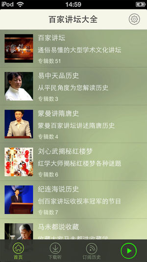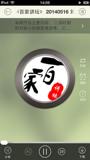 百家讲坛大全,是一款简单易用的手机听应用,也是一场思想学术交流的饕餮盛宴。戴上耳机即可聆听浩瀚的历史、经典的文学、波澜壮阔的战争、趣味盎然的收藏…… - 完整收录百家讲坛高清音频,与央视同步更新,快来试听! - 带你领略经典历史人文的魅力,一堂不可不听的人文历史课! - 同步推出多档高人气脱口秀,《晓说》《逻辑思维》,高晓松罗振宇邀你来尝鲜! - 免费内容+高清音质, 超爽极致体验,为你定制! - 顺滑界面,流畅操作,将用户体验做到极致的app store领先应用。 === 内容概览 === 《百家讲坛》 《百家讲坛》是中国中央电视台科学教育频道(CCTV-10)一款著…