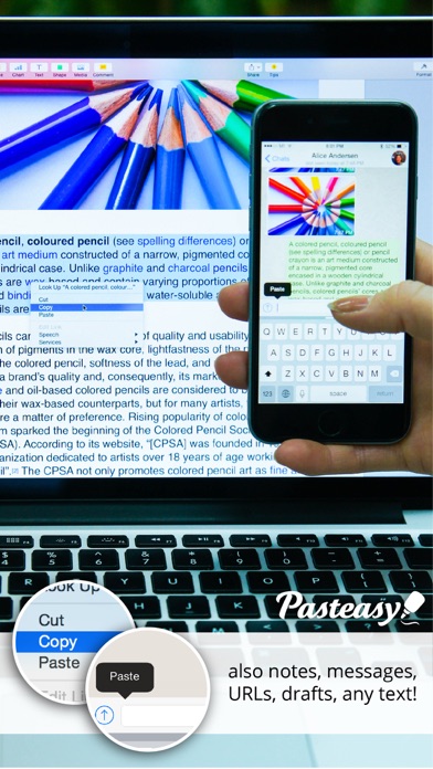 THE QUICKEST APP TO COPY TEXT MESSAGES AND PHOTOS BETWEEN YOUR PHONE AND COMPUTER! Pasteasy (read: “Paste-easy”) is a productivity app that simplifies and speeds up your daily workflow, saving you valuable time. It enables you to privately share the clipboard between your devices, so you can simply copy and paste to easily move content. Use it to copy text snippets, photos, links, screenshots and files (coming soon). For example: ● Compose a message on your computer and paste it to your iPhone to send. ● Easily copy photos from the iPhone album to your computer. Transfer multiple photos in one shot. ● Take screenshots on your computer or iPhone and watch them automagically appear on the connected device. ● Take live camera shots on your iPhone and quickly preview them on the computer in real-time. ● Copy a URL on your iPhone and Pasteasy can automatically open and load the webpage on your computer. The possibilities are endless! Whether you are a texting enthusiast, photo lover, graphic designer, mobile developer, student, housewife, businessman, writer, life hacker, or anyone who works with more than one device, you will find Pasteasy indispensable in your daily life. FEATURES: ● SIMPLE COPY AND PASTE Use native copy and paste actions. Pasteasy syncs the clipboard instantaneously in the background -- no extra taps. You don’t need to interact with Pasteasy other than for connecting the devices. Save valuable time. ● FAST, SECURE AND PRIVATE Encrypted over local WiFi for speed. No more waiting. It even works without WiFi, over personal hotspot. ● FLEXIBLE SHARING Scan barcode to connect to one or more devices, yours or friend’s. You don’t need an email address, a phone number, a shared link, a friend request or anything to share photos with them. ● CLIPBOARD HISTORY Save copied items in one place. You can browse, re-copy, preview, share or delete them. ● CROSS PLATFORM Copy across iPhone, iPad & computer. Tip: Please enable Bluetooth on connected devices to keep Pasteasy running in the background (works when connected to Mac OS X 10.9+ or iOS 7+ devices supporting Bluetooth LE). If Bluetooth is not enabled, the app shall automatically go to sleep after 3 minutes when in background. Download Pasteasy for computer from http://www.pasteasy.com
