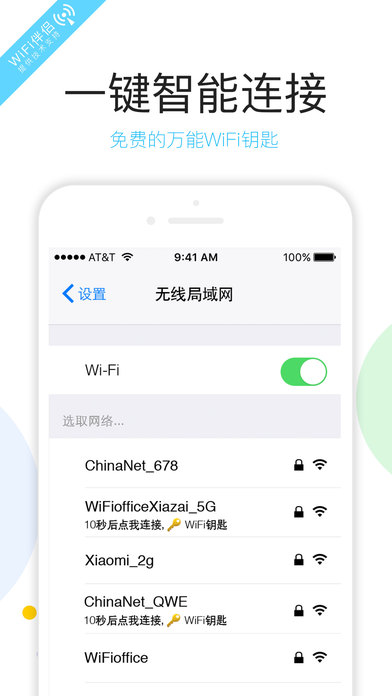 WiFi钥匙通过地理定位,自动搜索周边商家wi-fi,已累计为用户覆盖了全国超过100000000的WiFi热点,iOS9系统一键连接功能上线,用户无需截图即可实现一键连接wifi。WiFi钥匙致为用户提供更加安全的上网环境,接入中科院旗下资金的投资,在安全防控体系,保护用户的信息方面,更是国内领先的,是iphone手机用户安全连接WiFi的首选神器。