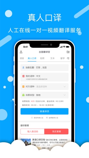 出国翻译官,瞬间本地人 出国翻译官是一款集成语音对话、拍照、文本翻译、真人实时视频翻译功能的应用。出国翻译官深度结合谷歌,微软,百度,科大讯飞,捷通华声,有道,搜狗,腾讯,Gennis,中科院等各顶尖实验室的语音识别,图像识别技术,神经网络机器翻译技术,帮助您在需要跨语言交流的时候达到最快最准的沟通效果。 【产品介绍】 1. 出国翻译官,目前拥有5000万遍布在全球210个国家与地区的用户 2. 出国翻译官,为您提供免费的实时双向语音识别互译功能,让您不用学外语也可能走遍全世界,带上出国翻译官,让您更自信地走向外面精彩的世界。 3. 出国翻译官,支持34种语言翻译,满足你的学习翻译,工作翻译,…