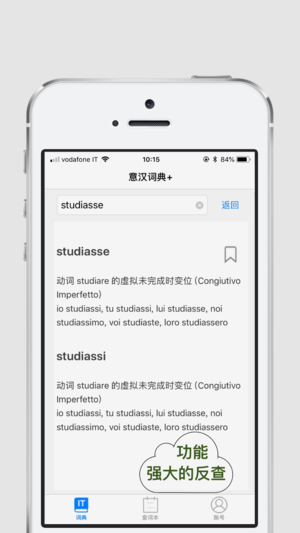 意汉词典+ 1)意汉,汉意,双查 2)动词变位,正,反查 3)意大利语单词模糊查询 4)市面最全的意汉词汇加资深语言学者严格审核词汇 5)和 yihan.it 词典网页版账户同步, 6) 和 yihan.it 不断更新的网络词库同步 如果遇到使用问题请微博 @博洛尼亚大学中国学联 或 @heartnest,我们会立即给您答复。