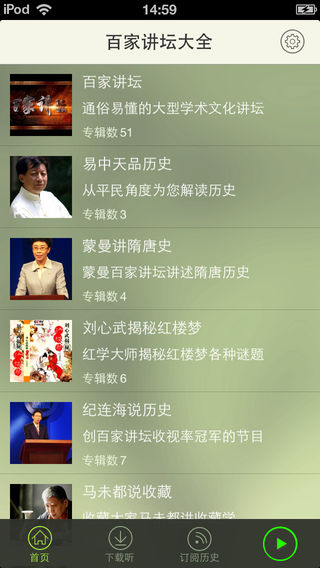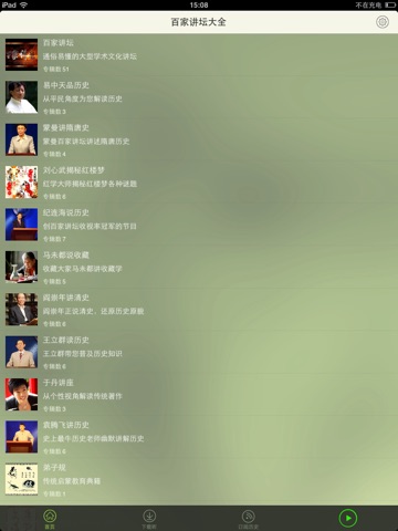 百家讲坛大全,是一款简单易用的手机听应用,也是一场思想学术交流的饕餮盛宴。戴上耳机即可聆听浩瀚的历史、经典的文学、波澜壮阔的战争、趣味盎然的收藏…… - 完整收录百家讲坛高清音频,与央视同步更新,快来试听! - 带你领略经典历史人文的魅力,一堂不可不听的人文历史课! - 同步推出多档高人气脱口秀,《晓说》《逻辑思维》,高晓松罗振宇邀你来尝鲜! - 免费内容+高清音质, 超爽极致体验,为你定制! - 顺滑界面,流畅操作,将用户体验做到极致的app store领先应用。 === 内容概览 === 《百家讲坛》 《百家讲坛》是中国中央电视台科学教育频道(CCTV-10)一款著名的科教讲座式栏目,该栏目选材广泛,曾涉及文化、生物、医学、经济等各个方面,逐步发展至今,现多以文化题材为主,并较多涉及中国历史、中国文化。其演播风格与学术性的理论研究相比较为平易,同时亦追求内容的学理性与权威性,力求雅俗共赏。该栏目自2001年7月9日开播以来,截至2006年10月,已播出1000余期,许多先前并不为百姓熟知的学术界著名人士由幕后推出,以通俗易懂的形式将许多晦涩知识传播于民众之中,虽然在个别议题上曾略受微辞,但整体而言,大多数观众都给予此栏目较高评价。同时,该栏目制作水平也不断改善,收视率逐年提高,并已成为中国中央电视台科学教育频道的一款品牌栏目。 《晓说》 高晓松的这档脱口秀节目由其好友韩寒命名为《晓说》,自2012年3月起每周播出,每集节目时长20分钟。《晓说》每期发起一个热门话题,由主持人高晓松自由发挥,说历史、评人物、聊八卦、论文化、谈热点,打造视频化的“高晓松专栏文章”。《晓说》还将在每个月制作一期特别对话节目,届时会请到当年明月、王朔等重量级嘉宾。同时,网友也可以实现和节目的全互动,每期节目会提前在网上公布话题,征集网友对该话题的看法,录制成视频,有独到观点的网友视频将在节目中播出,还会得到高晓松的点评。音乐人、导演高晓松首次跨界,送上清谈脱口秀节目《晓说》。一不当公敌、二不当公知,一切只因闲来无事小聊怡情。上说星辰满月,下说凡夫走卒,动机绝不无耻,观点绝不中立... 《逻辑思维脱口秀》 有种、有料、有趣!《罗辑思维》是一场自媒体试验,罗振宇做起了“手艺活儿”,凭着自己的知识和志趣,为大家读书,给各位讲故事,一起发现对这个世界的新思维。 下面引用一段罗振宇对《罗辑思维》的自解:希望成为大家的疯狂书僮,每天趁热端上三段读书心得,保证给得比盒饭多,营养比蒙牛强。感谢优酷和众位兄弟。各位转发赏看,都是客官;吐槽热捧,莫非厚恩。涕零顿首。 …… 快来下载百家讲坛大全吧!
