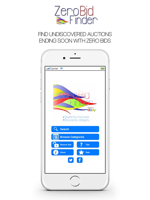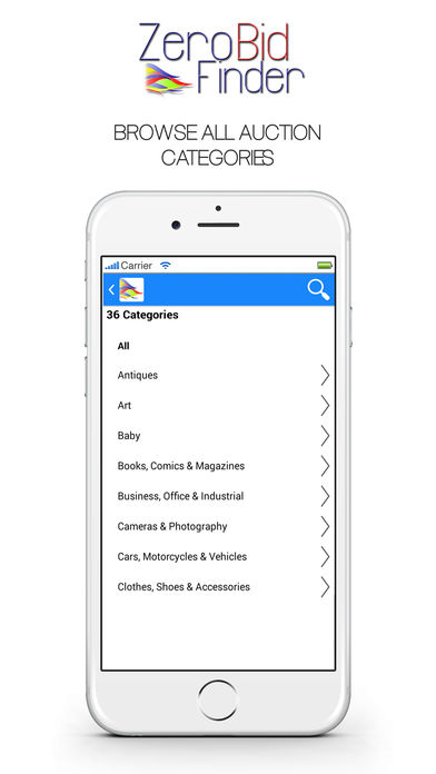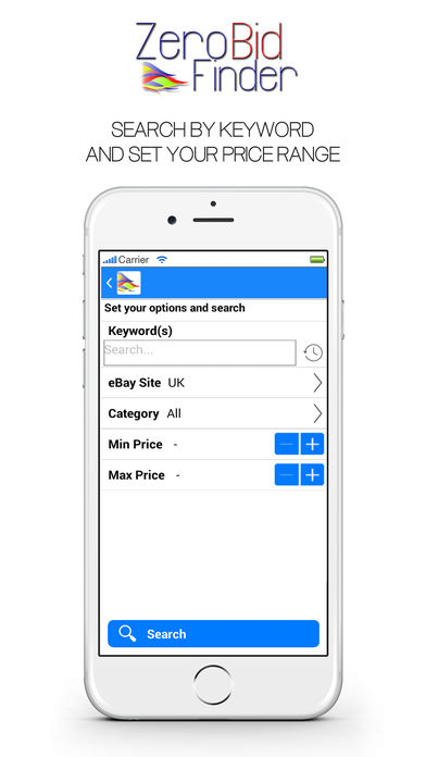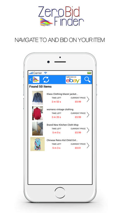 Hunt down for the very best deals and bargains eBay has to offer with Zero Bid Finder for eBay! A simple to use eBay search tool that finds all the auctions ending-soon that no-one else has discovered or bid on! We've helped over 50,000 users find those hidden auctions with zero bids or no reserve on them! Shop for all eBay items and categories including fashion, electronics, iPhones, iPads, watches, DVDs, and even Motors, new or used, and all at the touch of a button. We've help shoppers buy thousands of items this year and have some great success stories from you including Cars, Jewellery, iPads and Consoles....grab something amazing today! With the free Zero Bid Finder Tool for eBay mobile app you can: - Shop all auctions with zero current bids - Search by keyword(s) or browse eBay categories - Find no reserve auctions (tip: set max price to 1) - Navigate direct to eBay and bid on an item - Set max and min prices - Search history recorded - Facebook and Twitter links so you can share your best finds and get ideas for bargains you can find - Works with all eBay stores from: UK, US, Australia, Canada, Italy, France, Netherlands, Germany. Belgium, India, Hong Kong, Singapore and many more... - Works with eBay motors Tips: - Remember to have a good mobile/wireless signal, the app searches eBay directly so requires a strong connection - To search auctions with no reserve, select the max price to '1' - Search wide and often for the best results - If zero results appear there are no auctions for your search criteria that has zero bids. Trying widening your search. iPad users please note - landscape orientation is currently unsupported. Found a problem or have a suggestion? Please drop us a line at support@zerobidfinder.com we'd love to hear from you.