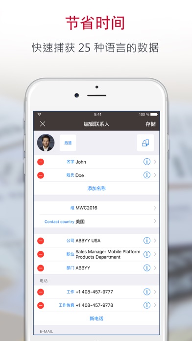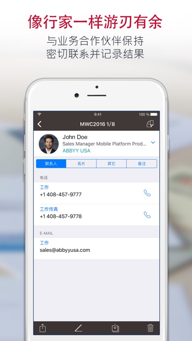 将纸质名片转换为数字联系信息,轻松进行管理! 从25种语言的名片中无缝捕获联系人信息,ABBYY Business Card Reader (BCR) 是一款强大的多功能通讯录数据管理应用程序,让您轻松方便地输入并管理业务联系人。 - 在“移动之星大奖”评选中,在“移动领域销售和CRM”类别获得“希望之星”大奖 由纽约时报,CNN,电报,计算机商业评论,Macworld大会推荐。 主要功能 - 无需再手动输入联系人信息到智能手机中。 凭借著名的 ABBYY 移动 OCR 技术,带给您无与伦比的数据识别质量和极高的速度,无需纠正或重新键入名片数据,让创建联系人变得既松又自动化。 - 在智慧型手机、平板电脑与电脑间轻松同步名片 使用ABBYYBCR.COM。如此一来,您就可以更轻松地从所有行动装置更新与使用您的名片资料库。 - 位于 BCR 自有存储器上的名片夹可方便地进行名片搜索,并可对联系人进行排序和分组。 您可以快速轻松地找到所需的联系人。 - 在名片夹中的“我的名片”组中,你可以用不同语言针对不同场合保存你自己的名片。 - 你可以很方便地添加和编辑名片文字备注,并在 BCR 存储器中进行浏览和查找。 - 快速验证联系人识别结果。 BCR 可突出显示不确定的字符并显示原始图像,以方便您进行确认或纠正应用的输出。 - 剪裁功能可将名片照片的所有背景自动剪掉,让它看上去更像是名片夹中的真实名片。 - 您可以通过电子邮件以 VCard 和 JPEG 文件形式或通过短信以纯文本格式,转发已识别的联系人数据。 - 更详细地了解最流行社交网络(Linkedln、Facebook 和 Twitter) - 在 ABBYY Business Card Reader 中,只需点按一次,即可在地图中搜索您的商务联系人的地址 - 通过将名片数据库导出到 Microsoft Excel,有效地在您的台式计算机上管理名片数据库。 其他特性 - Apple Watch. Now you won’t need to reach for your iPhone to remember somebody’s name and make a call. View contacts and make phone calls using your Apple Watch! - Automatic normalization of phone numbers. No matter how a phone number appears on a business card, ABBYY BCR will automatically put in all the missing parts, so that you can reach the contact even if the country code was omitted in print. - Autocompletion of addresses. BCR will correct any typos and fill in the missing address fields (e.g. postcode, ZIP code, or county). - Spotlight search. Find business cards stored in BCR using the Spotlight search on the main screen (swipe down to open Spotlight). - Automatic backups. Your contacts will be regularly backed up for you to make your valuable data 100% restorable. - 可识别 25 种语言的名片,包括多语言名片(最多同时包含 3 种语言): • 捷克语 • 丹麦语 • 荷兰语 • 英语 • 爱沙尼亚语 • 芬兰语 • 法语 • 德语 • 希腊语 • 印度尼西亚语 • 意大利语 • 韩语 • 挪威语(巴克摩) • 挪威语(耐诺斯克) • 波兰语 • 葡萄牙语(葡萄牙) • 葡萄牙语(巴西) • 俄语 • 西班牙语 • 瑞典语 • 土耳其语 • 乌克兰语 • 中国简体 • 中国传统的 • 日本 -------------- 免费版有广告支持,只能识别 15 个名片。 启用高级账户(自动续订订阅)可获得无限制的功能: • 名片识别数量无任何限制 • 导出到Excel • 自动备份 • 无广告 请注意,除非您在当前订阅期结束前至少 24 小时取消,否则到期会自动对您的订阅进行续订。 当您确认购买时,将通过您的 iTunes 账户进行支付。 购买后,您可以访问“账户设置”来管理您的订阅并可关闭自动续订。 在生效的订阅期内,您无法取消当前的订阅。 如果您购买了该发行版的订阅,在免费试用期内(如果有)任何未使用的部分都将作废。 -------------- Twitter @ABBYY_Mobile Facebook: facebook.com/AbbyyMobile YouTube: www.youtube.com/ABBYYHQVIDEOS Terms of Use: https://www.apple.com/legal/internet-services/itunes/dev/stdeula/ 如果您喜欢 Business Card Reader,请写下您的评价。 非常感谢!