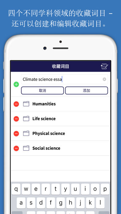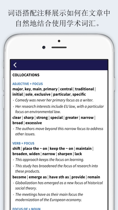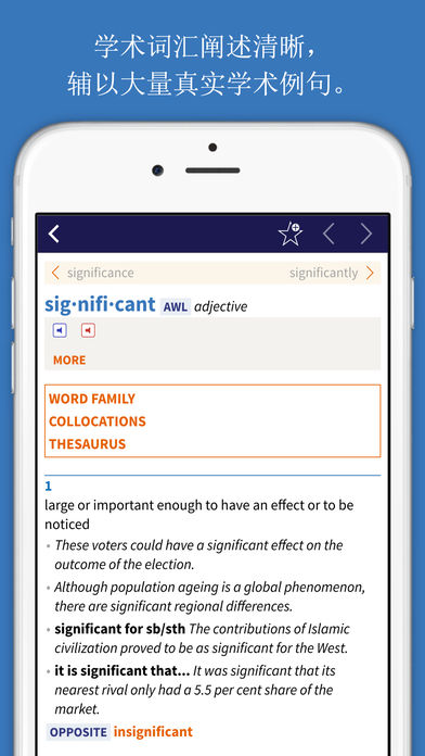 2015 年度英国文化协会 ELTons 英语教学创新大奖学习资源创新奖得奖者 Awarded “BEST OF 2016 - INNOVATIONSPREIS-IT” by Initiative Mittelstand 重要提示:此免费下载版本可供查阅范例词条。要激活整部词典,须在应用内购买。 您在学习英语吗?在学业上需要用英语写作吗? 理解学术文章中使用的词语,学习在您的书面作业中使用这些词语。 Oxford Learner’s Dictionary of Academic English 是专门针对学术英语的学习词典。如果您的母语不是英语,而正在修读以英语授课的学科,本词典应用将帮助您理解学术文章,提高您的学术写作水平。 主要特色 • 22,000 单词、短语和释义,阐述清晰,针对学术写作中的用法 • 参考自 8,500 万词的牛津学术英语语料库 • 超过 50,000 条来自语料库的例句 • 690 个词语搭配注释,提供超过 26,000 个搭配词 • 120 个用法说明,包括同义词辨析、用语库、语法说明和词语辨析 • 四个学科领域的词汇表(自然科学、生命科学、社会科学和人文学科),可根据需要添加或编辑 • 创建和整理收藏词目 • “学术词汇表”中的词均加有标记 • 所有词目配备英美真人发音 • 全文检索,查找包含搜索词的任何短语、搭配词或例句 • “是否要找 …?”功能和通配符检索,方便查找不会拼写的词 • 检索记录,查看最近检索的 100 个词目 • 一点即可跳查正文释义中的单词 iOS9 优化内容包括: • 多任务功能:滑出和分屏 • 收藏词目文件夹的 Spotlight 搜索 增加全面汉语界面(繁体字和简体字兼备)。 适合以下英语学习者: • 正在大学或高等学院修读以英语授课的学术科目 • 正在修读基础课程或语言先修课程 • 英语 B1-C2 级(中阶 – 高阶tra