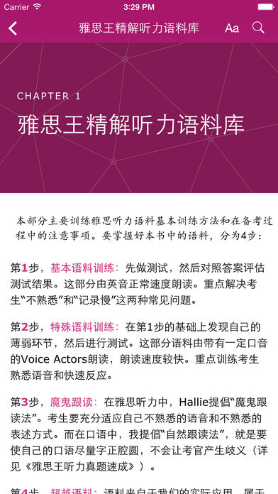 《雅思王听力真题语料库》(以下简称《语料库》)作为雅思备考类的畅销书籍,功能性强,针对考生听力薄弱环节提供了独特的训练方法,目前被雅思考生广泛接受。 为了制作出精良的交互式电子书,为用户提供更好的使用体验,同时弥补纸质书籍的局限性,知域为《语料库》设计了以下的主要功能: 难度设置:在《语料库》纸质版的配套音频中,每一节内容都提供了两段音频,除了单词朗读顺序的不同,两段音频在听力难度上也有所不同。所以在电子版《语料库》中,用户在开始听力朗读前,增添度设置,可以让用户根据自身条件选择不同的难度。 朗读语速设置:《语料库》根据用户训练的不同阶段,要求用户逐步加快音频的朗读速度。纸质版《语料库》要求用户在计算机上的音频播放器中手动设置音频播放速度,从而达到调节朗读语速的效果。电子版可设置不同阶段的音频播放语速,使用户能够进阶学习。 Feedback统计:《语料库》要求用户在每一次训练结束后对听写错误的单词进行统计,同时按照不同的错误点进行记录,最后形成类似“训练日记”的统计表,让用户直观的观察自己的训练成果。电子版中我们将加入自动错误统计功能,用户在每次听写结束后,用户只需要点击拼写错误的单词,选择错误点,知域将会自动统计出这次训练的结果,每一个错误点出现的次数都会被统计出来。知域同时会记录所有的训练结果,最后可以生成训练成果曲线,让用户更加直接的看到自己的训练成果。 单词记忆卡功能:为了让用户更加方便的记忆训练过程中听写错误的单词,知域提供单词记忆卡功能,让用户可随时记忆不熟悉的单词。