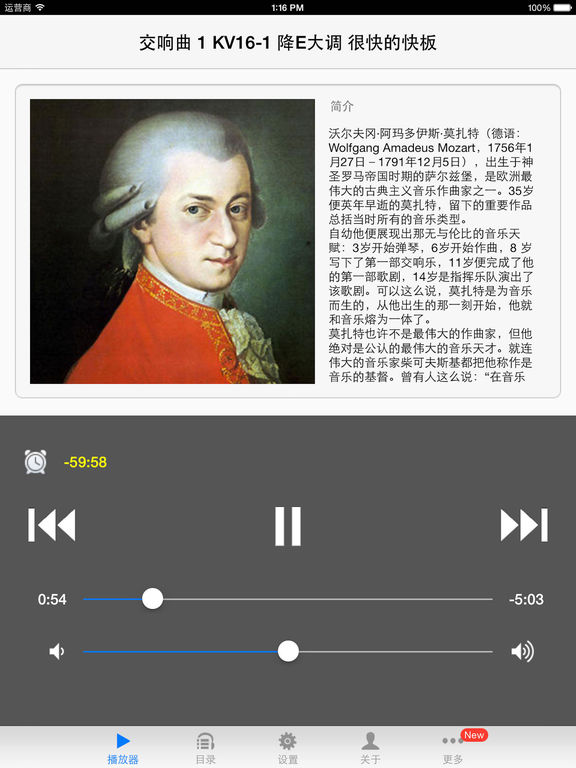 沃尔夫冈·阿玛多伊斯·莫扎特(德语:Wolfgang Amadeus Mozart,1756年1月27日-1791年12月5日),出生于神圣罗马帝国时期的萨尔兹堡,是欧洲最伟大的古典主义音乐作曲家之一。35岁便英年早逝的莫扎特,留下的重要作品总括当时所有的音乐类型。 自幼他便展现出那无与伦比的音乐天赋:3岁开始弹琴,6岁开始作曲,8 岁写下了第一部交响乐,11岁便完成了他的第一部歌剧,14岁是指挥乐队演出了该歌剧。可以这么说,莫扎特是为音乐而生的,从他出生的那一刻开始,他就和音乐熔为一体了。 莫扎特也许不是最伟大的作曲家,但他绝对是公认的最伟大的音乐天才。就连伟大的音乐家柴可夫斯基都把他称作是音乐的基督。曾有人这么说:“在音乐史上有一个光明的时刻,所有的对立者都和解了,所有的紧张都消除了,那光明的时刻便是莫扎特。” 音乐列表: 交响曲 1 KV16 降E大调 交响曲 4 KV19 C大调 交响曲 5 KV22 降B大调 交响曲 6 KV43 F大调 交响曲 7 KV45 D大调 交响曲 8 KV48 D大调 交响曲 9 KV73 C大调 交响曲 10 KV74 C大调 交响曲 12 KV110 G大调 交响曲 13 KV112 F大调 交响曲 14 KV114 A大调 交响曲 15 KV124 G大调 交响曲 16 KV128 C大调 交响曲 17 KV129 G大调 交响曲 18 KV130 F大调 交响曲 19 KV132 降E大调 交响曲 20 KV133 D大调 交响曲 21 KV134 A大调 交响曲 22 KV162 C大调 交响曲 23 KV181 D大调 交响曲 24 KV182 降B大调 交响曲 25 KV183 G小调 交响曲 26 KV184 降E大调 交响曲 27 KV199 G大调 交响曲 28 KV200 C大调 交响曲 29 KV201 A大调 交响曲 30 KV202 D大调 交响曲 31 KV297 D大调 交响曲 32 KV318 G大调 交响曲 33 KV319 降B大调 交响曲 34 KV338 C大调 交响曲 35 KV385 D大调 交响曲 36 KV425 C大调 交响曲 38 KV504 D大调 交响曲 39 KV543 降E大调 交响曲 40 KV550 G大调 交响曲 41 KV551 C大调 交响曲 KV19a F大调 交响曲 KV111a D大调 交响曲 KV196 D大调 功能特点: 支持后台播放 可以选择是否开启软件立即播放 可以选择是否连续播放 可以选择是否随机播放 可以选择是否定时结束播放, 可以选择定时结束的时间 可以通过邮件快速地分享给好友 支持iPhone,iPod touch和iPad设备