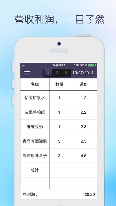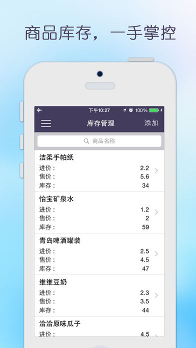 掌上收银系统,集收银台、扫描枪、库存管理,营业报表于一身,专为中小型商家而设计! 便利的掌上收银服务包括: 1.收银 通过扫描商品的条形码,或者直接选取,来添加顾客购买的商品,可以编辑、清空这些信息,软件会根据这些信息自动统计应收金额,录入实收金额后,算出找零金额; 2.库存管理 将商品的条形码、名称、价格、库存、供应商信息录入完成后,该商品会被添加到库存。 3.营业报表 通过日报表、月报表、年报表,来呈现营业成本、营业收入,净利润等营业数据.