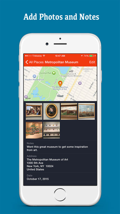 Places Bookmark, 地址书签App是一个记录地址的私人地图笔记本应用。您可以创建文件夹,归类您最喜欢的地址,添加照片和日记。同步备份数据。App的基本功能如下: ***创建地址分类书签 ***通过当前位置,地址搜索,地图查找,照片GPX,和其他附近商店等方式导入您想要收藏的地址。 ***添加照片和笔记 ***快速地址导航 ***iCloud和Dropbox备份 ***iPhone和iPad通用App ***自定义地址pin的颜色 ***默认安装样本文件夹 适用案例: 旅行爱好者记录自己旅游足迹,和未来的旅行规划 美食老饕来记录喜欢的餐馆 租房,购房的看房记录 摄影爱好者记录自己的拍摄 其他需要用到地图来记录需要 地址书签是我们继足迹-我去过和我想去”App后,从新设计开发的一个全新的App。希望您能够喜欢! http://www.greenlake.co http://www.facebook.com/greenlaketech