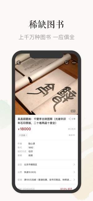 孔夫子旧书网:买您买不到的书,就上孔夫子旧书网。国内专业的古旧书籍、二手书、艺术品收藏交易拍卖平台,国内领先的中文网上图书商城。网罗天下图书,传承中华文明。 书店区:汇集全国各地的近十万个卖家,展示未售图书几千万种;海量优质特价书、折扣书、二手书,是爱书人的淘书圣地。 拍卖区:每日新增1万多种拍品,从明清古籍、民国期刊、名人信札到近期出版的新书,从字画、连环画、邮票、钱币到古玩杂项,都能够以合适的价格购得。 作为民间古旧书收藏的风向标,孔夫子旧书网为买家和卖家提供最有参考价值的古旧书拍卖数据及分析。您可以免费开书店卖书,将个人收藏的书籍或艺术品交易变现。 【经营品类】 - 图书:古旧书、二手书…
