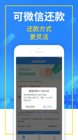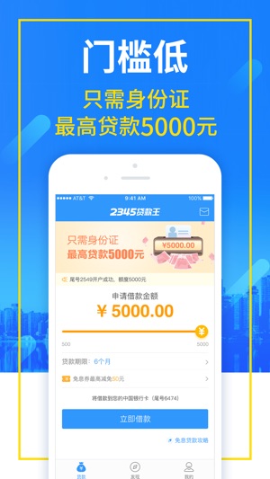 【产品特色】 1、门槛超低:无抵押、无担保、无面签,凭身份证就能贷款5000元; 2、审核极快:一键申请最快30分钟放款,简单、快速、借得到; 3、产品推荐:超多借贷产品一并推荐,随借随到。 【平台背景】 1、A股上市公司(股票代码:002195)上海二三四五网络控股集团子公司广州二三四五互联网小额贷款有限公司旗下金融产品,2000万用户力荐; 2、与持牌金融机构战略合作,联手打造; 3、通过银监会审核正规借贷产品,值得信赖。 【联系我们】 贷款王微信公众号:daikuanwang-2345 贷款王官方网址:daikuan.2345.com