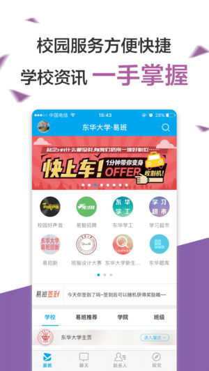 易班(www.yiban.cn)是一个承载着青春梦想,为在校大学生提供教育教学、生活服务、文化娱乐服务的综合性互动平台。 在这里,您可以和经过“校方认证”的大学生进行交流互动;也可以从各校老师们的官方账号下获取第一手的课件资讯。 易班正在努力营造一个校园内乐活、乐玩、乐学、乐教的平台。赶快下载客户端,体验不一般的易班吧! 【随时随地的畅所欲言】与好友、同学、老师的轻便畅聊体验,让沟通交流零距离。 【潮流时尚的探究互动】分享近照、状态、想法,尽情评论、点赞、爆新料,丰富的校园资讯触手可及。 【实时推送的各类动态】班级活动,辅导员通知、好友动态即时推送,绝不错过任一时事信息。 【不断丰富的轻便应用…