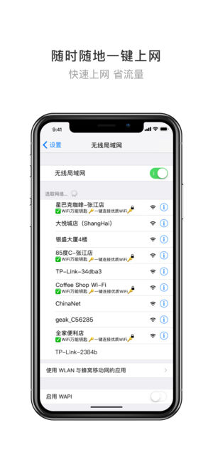 【WiFi万能钥匙】通过国家信息安全等级保护三级标准验收。WiFi万能钥匙在政策上符合国家网络安全法的等保建设要求,用户的网络安全可以得到充分保障。 WiFi万能钥匙为您提供: * 一键连接,高速上网 * 海量安全热点遍及全球,随时随地一键联网 * 上网安全,实时检测 * 智能识别风险WiFi,安全检测全程保护 * 商务、玩家、重度网虫必备 * 读书、新闻、视频……个性化推荐提供好看的每日资讯 * 运营商热点轻松连 * 全国移动、电信运营商千万公共热点全覆盖 WiFi万能钥匙致力于为用户提供免费、安全、稳定的上网服务,让用户随时随地轻松接入无线网络,使用各种在线服务,不再为无网、断网…