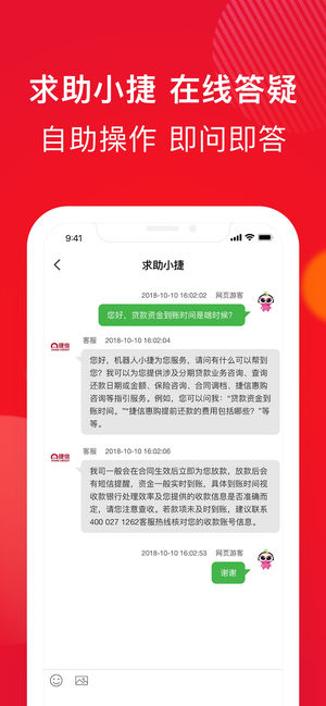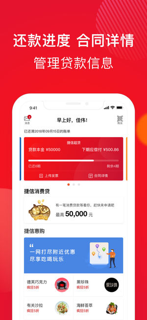 应用介绍: 捷信金融,贷款超容易,放款超迅速,更新增保险等服务! 捷信金融--是一款急速贷款借钱分期神器,凭身份证和银行卡即可在线申请及审批,5分钟极速到账。 新客户可享受超高贷款额度,50000元超贷贷款额度,贷款金额、贷款期数可灵活选择。 【平台介绍】 捷信消费金融有限公司是首批四家银监会消费金融持牌公司之一,为您提供银行级安全、专业、便捷的小额贷款、大额贷款、现金贷,分期贷款,分期商城,保险等服务;手机借钱贷款就找捷信金融,轻松帮你解决【贷款】【借钱】【借款】【商品分期】等所有难题; 【产品优势】 1、门槛低:一张身份证即可办理; 2、速度快:线上审批,5分钟放款; 3、额度高:最高50…