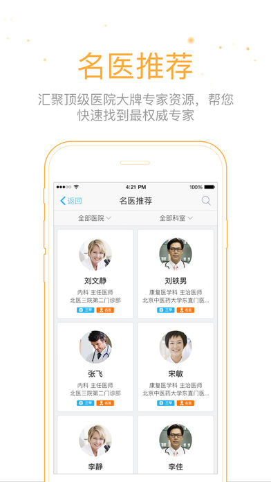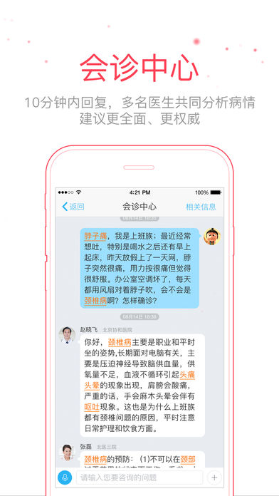 挂号3小时,候诊1小时,医生却可能只跟你交流了不到3分钟,是不是很郁闷? 好不容易看完病抓了药,走出医院,便很难再次联系到自己的主治医师,是不是很苦恼? 下载安装医生树APP,小病小痛,在线快速问医生,避免病急乱投医;预约复诊,随时在线咨询主治医师、预约挂号,不再无谓的浪费时间。 医生树能为您提供哪些服务? 1、疾病查询:拥有最全面、最准确的医患问答数据库,可以在线查询一切疾病相关的问答数据,了解权威专家对疾病的分析诊断和治疗建议; 2、会诊中心:医生树首创在线会诊模式,每一个问题都由多名医生解答,医生之间对病情进行讨论分析,让解答更科学、更全面、更权威; 3、诊后咨询:异地就诊的病人,不用每次都长途奔波,耗时费力,只需添加您的主治医师为私人医生,便可以随时与他进行沟通交流,完成简单的复诊和疾病治疗指导; 4、电话咨询:直接与专家本人进行电话沟通,分析病情,权威建议让您不再忧愁; 5、门诊预约:简单便捷的流程找到三甲医院专家,消除排队挂号烦恼,让好大夫不再遥远。 通过与全国各公立医院医生的深度合作,医生树将会持续为您提供最及时、最精准、最实用、最权威的健康服务。