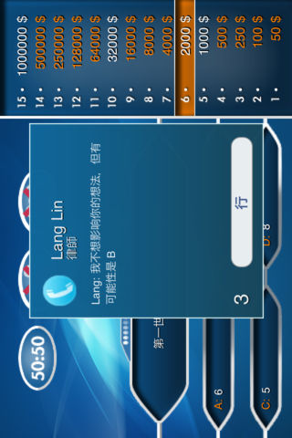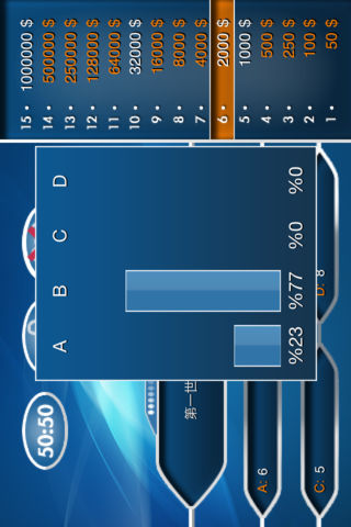 百万富翁 now avaiable for China. 百万富翁-这个游戏不但将会提高你的文化知识而也会将你跟朋友一起度过一个完美的时间。百万富翁-游戏不但测验综合知识而是也有指导性和娱乐性的活动。 问题库存 游戏中心 没网络 可以使用3个求助 其他特点 游戏中从50 $开始、通过15 个步骤、答对就会中将百万$ 在游戏中可以使用通配符来一半。 可以通话方式来求助,在这个项目中可以利用其他人的智能。 按难度,会降低答对效率 到了1000$和3200$ 你可以放弃回答问题。请报数给游戏中心。 每一个问题有限制几秒 答对所有的问题会成为百万富翁 -------------------------------------------------- ★百万富翁, wits its broad question archives and hard content, is waiting for you. While playing you will enjoy yourself and your friends. It will definitely end your boredom. With 百万富翁, most enjoyable moments are waiting for you. With the help of iMillionaire, you can both enhance your general knowledge and have amusing time with your friends. 百万富翁 is not only a general culture competition, but an instructive and amusing application. ★ Broad Question Archives: Thanks to its broad question archives, you will have a chance to meet various questions and compete as long as you want. You can compete with your friends and also check your abilities. Your general knowledge will enhance. ★GAME CENTER You can make your score written in Game Center. Your name can be seen among thousands. On the top of the list, you can say “here I’m”. ★ No Need Internet: You don’t need an internet connection. Without worrying, you can play wherever you want, on the bus, underground or at your office or home, ★ 3 Jokers Option You can call your friends or ask audience and you can also have a chance to choose in half option to know the questions. With the help of artificial intelligence, while you are using your jokers, it will direct you according to the difficulty levels of the questions. ★ OTHER FEATURES ✔ Starting with 50 euros, you can reach 1 million euros in 15 steps. While playing, you can use your in half option ✔ There is a telephone joker option, in this section, artificial intelligence application has been used. According to its difficulty level, the chance of giving the right answer is reducing. ✔ There is 1000 Euroand 32000 Euro grades. You can save your score at the game center ✔ You have seconds limit for each question. ★If you know all the questions, you will be a 百万富翁 ★ Good Luck!