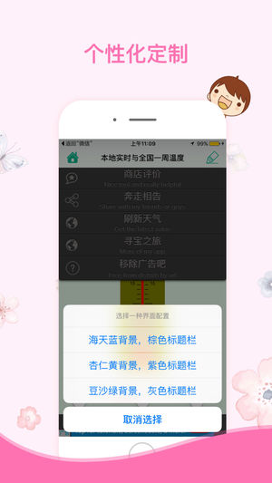 此应用提供的值供您参考(中国中央气象局提供)。 自动定位用户地理位置,然后根据当前地理位置显示当地的室外温度(在中国大陆地区有效) 特点: (一)简洁,漂亮,变化的界面。 (二)温度的动态图形显示,自动更新数值。 (三)您可以根据个人喜好调节界面元素。 (四)该应用适用于中国地区,计划到中国旅行的您也可以使用。 第一版获得接近五星的好评,并长期排名在天气类新品推荐第一名! 列举一些作者的评价,例如: 1)作者: 虎达 温度计挺好的,方便了我们,保证了生活质量。 2)作者: 斑斑寻找幸福生活 非常实用 3)作者: wangql 重名了 很不错