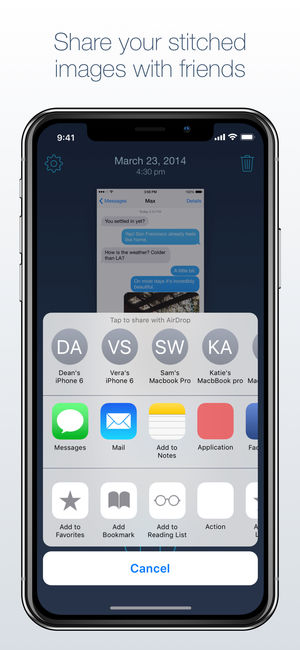 Automatically stitch your screenshots into one long image with Tailor. Ever wanted to share a conversation with a friend, but it wouldn't fit in one screenshot? With Tailor you can! Just take a few overlapping screenshots and Tailor will magically align and stitch them together for you. No more man…