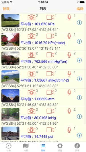 ### 仅适用于iPhone 6, iPhone 6 Plus, iPhone 6s, iPhone 6s Plus, iPhone 7, iPhone 7 Plus, iPad mini 4, iPad Air 2, iPad Pro ### 本App主要用于气压的量测及记录,并可搜集邻近气象站的气象资料(如:气温、湿度、风速、风向、雨量、云量),本App具有以下特点: 1) 量测值即时以类比式仪表及动态曲线图呈现。 2) 可依使用需求设置量测时间及量测频率。 3) 提供多种单位(kPa, hPa, mbar, mmHg, Torr, at, kgf/cm^2, atm, inHg,…