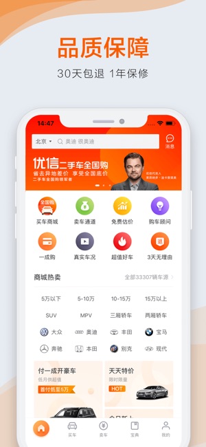 全国购 1、消除地域价格差距,省去异地差价; 2、享受全国底价,全国海量好车,轻松底价购。 买车服务 1、优信认证车源经过315项专业检测,30分钟高清视频检测,VR看车,沉浸式场景体验,真实车况,一目了然; 2、20万辆认证好车,专人实地验证,30天包退,1年保修,新增3天无理由退车服务,免除您的后顾之忧。 卖车服务 1、便捷卖车:随时随地发布出售信息,您的爱车报价高,资金到账变现快; 2、上门检测:免费上门检测,卖车方便快捷,报价高、报价快。 【联系方式】官方客服热线:10106088 【官方微博】@优信二手车 【官方微信】@优信二手车(uxinfuwu)