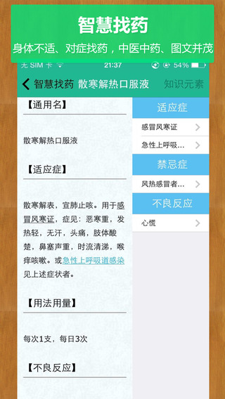 亲 面对“吃神马药?肿么吃?偶这种病适合吃这神马药啊?”你还愁眉不展、不知所措嘛? 亲 每每面对各种各样的小药丸、汤药不知如何开口? 亲 每当夜幕降临的时候,你还会沮丧的说“oh my god!!! 偶又忘记吃药咯”,你还时不时问自己偶这是肿么了嘛? 《智慧中医药》横空出世咯!!!健康生活只为你而来,全方位无死角的教你如何用药,达到掌握药品,合理用药,健康生活。在这里!!!生命的季节永远是春天。 亲们由淫家来为大家来解开《智慧中医药》她的神秘面纱。咱们的《智慧中医药》是一款通过精心编排、汇精聚优、准确权威,高科技的东东哦!淫家的淫友们呕心沥血之作哦,他们精心设计带给大家最贴心、最有爱的健康用药知识。 《智慧中医药》由国内最权威最专业的医疗公司——北京震元科技有限公司医疗APP团队研发,是一款专门面向大众家庭用户的药品信息查询及日常安全用药辅助工具。应用汇集了中华药典书籍等权威用药数据和以及提供给用户便捷友善的交互设计,提供对症找药、服药安全警示,用药提醒、药品/保健食品信息查询,医学小工具等功能。 软件特色: 【药品分类-贴心方便你】按照咱中国老百姓的用药习惯将常用药品分门别类,方便而直观的查询中成药、中草药这两大类药的详细信息。药品分类里面详细的描述了该药品的主要成份、性状、功能与主治或适应症、检查、不良反应、禁忌症、注意事项以及不同人群的用药事项等(很全面的哦!)。最让淫家感动与激动的是还有中草药!!!中草药里面竟然有图!!!(鼓掌)有图有真相啊有木有!!! 【智慧找药-专业只为你】导航模式收录专业的症状描述,提供百万医生推荐的常用药品;通过将药品知识与疾病的准确对应,从而达到由病找药,由药治病的精准快的健康之路。 【用药提醒-时刻呵护你】通过将自己生活饮食习惯、运动和吃药的时间紧密关联,设置服药提醒从而达到及时用药精准治疗的效果。PS:自从设置了用药提醒,妈妈再也不用担心我忘记吃药咯。 【散播健康-爱护你】亲们,《智慧中医药》通过从饮食、运动、烟酒、减肥、心理等多个方面,向用户展示了一种全面而健康的生活方式,对于减少滥用药物、错误用药的发生和危害、促进公众生活质量的的提高有较好的指导作用。我们的宗旨是散播健康,传递爱,在这里!!!生命的季节永远是春天。 亲 你还在等神马?赶紧行动吧!