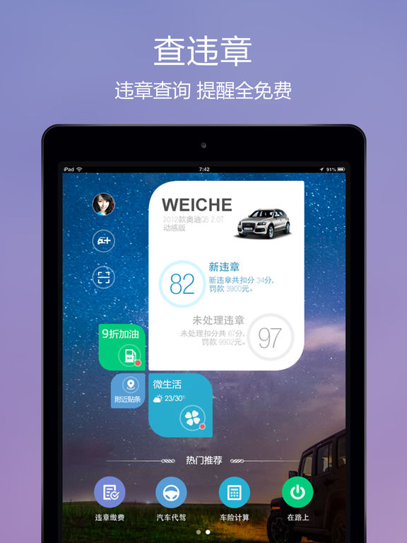 中国最好的车主服务APP 免费支持全国车辆违章查询300+城市,违章主动提醒,快速稳定 在线违章缴费、车辆买卖、司机招募等全方位用车服务。 -------优势功能------- 【主动提醒】违章查询、尾号限行、摇号结果,最新动态主动提醒 【车主服务】违章缴费、二手车买卖、汽车代驾保养、车主贷款,一键下单 【贴条地图】告诉你具体路段贴条风险,从此和违章停车说88 其他功能简介: √ 云端绑定:违章数据全保存,历史记录随时查 √ 违章预警:高发违章点、新增违章点重点预警 √ 我的钱包:账户余额、优惠券、交易记录一目了然 √ 天气指数:熟知每日天气温度、洗车指数 √ 销分、年检提醒:及时智能销分提醒、年检提醒 √ 个性背景:更多定制酷车主题、设计师精心设计的封面 √ 周边生活:快速锁定加油站、停车场、摄像头等车主关注地 √ 多车多城:同时查询多台车辆,多个城市的违章数据 【我们寄语】 用户群:257034393 合作服务:bdgroup@weiche.cn 我们不会停止对产品的热忱、对完美的追求!点点滴滴的优化,都为了给你最好的体验。如果在使用中有任何问题或者建议,欢迎联系反馈。 -----------------------