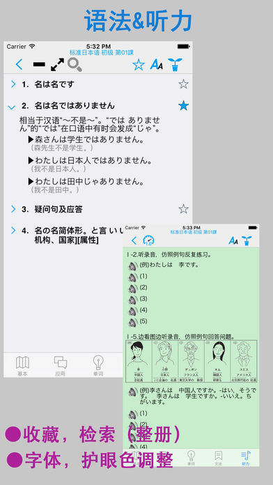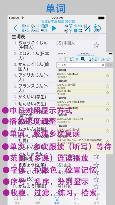 本APP参照《新版标准日本语初级》制作而成。包含了初级上下册48课的生词表,课文(会话),语法解释及部分课后练习的听力部分。全部的课文和生词都配有真人高音质发声。您可以通过手机和平板进行下载。方便任何有需要的朋友方便快捷的学习,快速强化您的听,说,读,写能力。本APP集成了超强的复读功能,可以根据自己的需要对每个单词、每句话或者整篇内容进行一遍或多遍的复读,洗脑式的复读可以加强记忆。同时,您还可以在“设置”里进行设置后台播放,方便您在移动中使用。 (注:如果您有任何购买问题咨询或意见反馈,可通过新浪微博:橙汁APP,或微信chengzhiapp 和我们取得联系) 语音复读模块: 在会话,课文和单词部分中,除了手工点击可以播放外,还集成了超强的复读功能。具体包括: ① 通过词[句]([词])按钮【左2】 调整 一句话/单词 的 单次复读次数(最大为99次)。 ② 在①的功能基础上,还可以通过[篇]按钮【左3】来调整整篇的复读次数(最大99次)。 在和①的功能组合使用的时候,一句话/一个词 最大可以复听(99x99)次。 ③ [音速]按钮【左4】用来调节发音的速度(0.5~2.0),帮助您找到适合自己的语速。逐渐的加强听力。 用来调节发音后的等待时间,(0.1~10),您可以在设置中设置适合自己的默认发声的速度。) ④ [等待]按钮【左5】置适合自己的默认发声的速度。)使用该功能可以方便您进行听写和跟随朗读。同时该功能也配合[句,词]功能进行多次跟读。 (您可以在设置中设置等待时间的单位(单词发音长度单位或时间秒单位)。) ⑤[范围]按钮【左6】用来调节复读的范围,通过该功能可以实现多课连续朗读。该功能可和上述①、②、③的功能同时使用,让您最大限度的使用复读功能。连课范围是:进入的课开始,选择的连课结束。例如:复读3-16课:第3课进入,选择16,点击播放即可。 ⑥ 如果在设置中打开后台播放功能(默认打开),就可以让您设置的复读声音进行后台播放。您可以通过耳机的线控进行停止/继续,在有在连课的时候,更能通过线控进行切课。(单击2次换下一课,单击3次换前一课,单击一次播放/暂停。) ⑦ 按钮 [▶]/[■]【左7】进入复读开始/停止。 基本(文型,例文),课文,会话: ①为方便初学者,本APP为文章中的每个汉字加上了注音,您可以通过[ひらかな]按钮进行显示或隐藏的切换。 ② 显示切换:您根据自己的需求,通过工具栏上的[中/日/中日]的按钮进行中文或日文的显示/隐藏的切换。 单词部分: ① 显示切换:您根据自己的需求,通过工具栏上的[中/日/中日]的按钮进行中文或日文的显示/隐藏的切换。 ② 收藏模块:您可以通过每个单词右边的[星号]按钮,对单词进行收藏。并通过顶部的[星号]按钮,对收藏的单词进行过滤显示。 ③序号显示:可通序号显示按钮进行序号显示临时切换。 ④分列显示:更改屏幕的单词显示方式(上下显示,左右显示)。 ⑤乱序显示:更改屏幕单词的显示顺序。(支持复读) ⑥单词过滤:通过过滤按钮可以进行显示范围的调整。 ⑦练习模块:通过顶部的[练习]按钮,您可以切换到单词的练习模块。本APP集成了“中文->日文”、”日文->中文“、”中文->语音”,“听说比对” ,“单词拼写”等(以下)五个练习模块。(※ 1,※ 2,※ 3) a. “中文->日文”练习:根据中文内容选择相应的日文。 b. “日文->中文”练习:根据日文内容选择相应的中文。 c. “语音->中文”练习:根据听到的声音选择相应的中文。 d. “听说比对” 练习:通过录音,及回放比对您的发音和标准发音。 e. “单词拼写” 练习:通过提示的中文,通过键盘(kana或罗马字)拼写出假名。 ※1 练习模块可和收藏模块进行配合时,可对自己选定(收藏)的单词进行练习。 ※2 练习模块可和范围模块进行配合时,可对特定范围进行练习(例如:第一课进去,选择连课16课的时候,练习范围就是1-16课的单词)。 ※3 练习模块可同时配合收藏,连课2个模块一起使用。 语法解释: 收纳了课本中的语法解释部分的所有语法及例句。 听力练习: 对每课,课后练习的听力部分进行整理(问题部分含听力答案),方便您系统的学习后,对所学内容的巩固。 五十音图: 包含了日文字母,清音,浊音,拗音的平假名 ,片假名,罗马字及其相对性的发音。 其他: ◎你可以通过左右滑动进行切换课(向左滑动上一课,向右滑动 下一课)(※5) ◎在设置中您可以设定使用后台播放(默认) ◎在设置中您可以设定默认的语音速度 ◎在设置中您可以设定后台播放时定时关闭的时间 ◎在文法界面,右上角有一键打开全部文法的按钮 ※5 会话,单词的滑动范围:上一课是选定的课,下一课是最后一课。文法的范围是(1~最后课) 本APP采用iphone,ipad的双版本设计,一次购买,可在iphone,ipad上同时使用。 APP 中的大量内容,是作者手工录入的,如果您发现不对的地方,望在APP里的意见反馈中联系我们,我们会在定期的版本更新中,修正您提出的问题。谢谢。 如果您喜欢这款app,请赠予评价,将是对我最大的鼓励,您的好评会让我更有动力将这款app做到最简洁,最方便,最实用!! 注1:本APP不含有内购和广告。 注2:本APP不是电子版的教科书,是一款配合教科书的学习用的APP,我们侧重了学习语言最重要的2个部分-听力及其单词记忆,为此我们开发了这款带有超强复读的APP,并对单词部分提供多种练习。 注3:如需想对APP进行功能试用,请下载,大家的日语体验或标