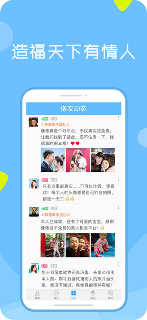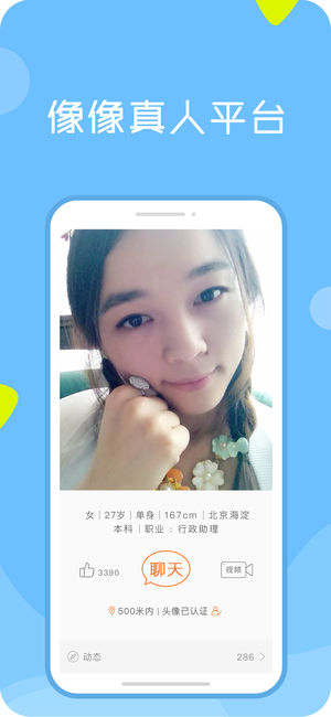 小视频相亲大会火热进行中! 像像是以“真人真头像”为特色的交友聊天软件,真人交友,真人聊天,个个都是本人照! 主要功能: 1、像像用户的头像都是本人真实照片,都经过严格的真人认证! 2、可以免费参加小视频相亲大会,交友成功率更高! 3、双方互加像友后可以用文字、语音、图片免费聊天! 4、像友之间还可以一对一视频聊天,沟通更亲切! 5、可以通过动态功能随时分享新鲜有趣的事,还可以相互点赞和评论。 6、开启定位后,可以随时和附近的人互动聊天。