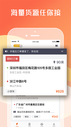 轻轻松松月入过万,让赚钱变得更容易! ****【操作简单】**** 操作方便,容易上手,分分钟接单 ****【百万订单】**** 每日上百万订单,抢单随你喜欢 ****【收入颇高】**** 客单均价150元,每天10单,月收入轻松过万 ****【超多福利】**** 车贴补助,加油减免,每月关怀、社保、无车加入、轻松办理信用卡、免费wifi,流量随便用 ****【无空返】**** 往来无空车,成本减半,利润翻倍 ****【全智能】**** 城市智能推送,告别路边趴活 ****【大车队】**** 自荐客户,拓宽客源,优先接单 匹配车型: 小面、中面、金杯、依维柯、单双排货车…