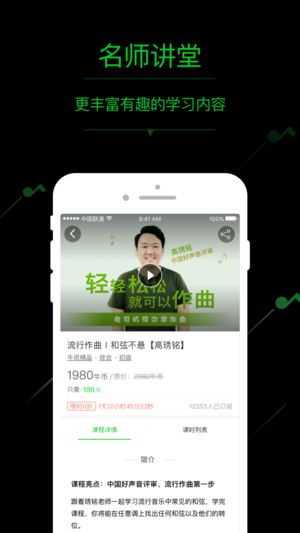 明星教你学唱歌,大师陪你玩音乐。顶尖的歌手乐手,百部视频教学,专注致力于打造中国在线音乐教育的领先平台,并且开设线下牛班音乐学校,为有音乐情怀的声乐、器乐爱好者带来最专业的学习体验。
