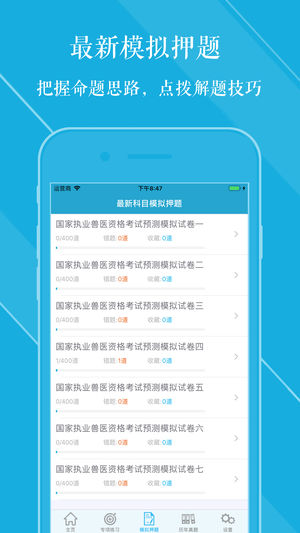 本软件为国家执业兽医资格考试兽医全科类题库的软件,精心准备了2018年最新考试题库含解析。专项章节练习,历年真题、模拟试题、考点汇总。为考试的提供了充分的复习准备,可随时随地学习练习,有效帮助顺利通过考试,学习知识通过考试必备神器! 【2018题库介绍】 基础科目 兽医法律法规与职业道德 A1、A2、A3/A4、B1试题及解析 动物解剖学、组织学与胚胎学 A1、A2、A3/A4、B1试题及解析 动物生理学 A1、A2、A3/A4、B1试题及解析 动物生物化学 A1、A2、A3/A4、B1试题及解析 兽医病理学 A1、A2、A3/A4、B1试题及解析 兽医药理学 A1、A2、A3/A4、B1…