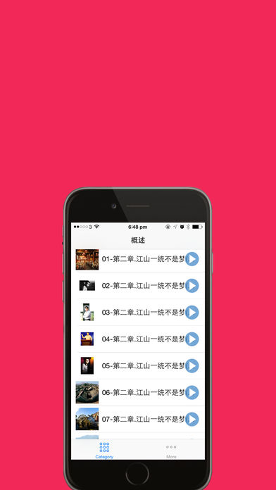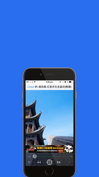 因为一系列幽默风趣的讲课视频公开后,袁腾飞老师迅速走红。视频片断在一个月内的点击量突破100万次;并被网友称为“史上最牛历史老师”。 我们随着袁腾飞老师清晰、风趣、独特的讲述,一同穿越千年的时空,神游万里,或喜或悲,或笑或颦,或忧或惧,难以自己。我们的感觉非常一致,都大呼过瘾或者不过瘾:镜头前往往显得如此漫长的四十五分钟,在袁腾飞的挥洒演绎之下,竟如云烟电光一般短暂。 将原本枯燥的历史讲得通俗易懂、妙趣横生,果然不愧“史上最牛历史老师”的称号! 功能简介: 1.支持iPhone(包括iPhone5),iPod touch和iPad设备。 2.自动记录播放位置,下次打开可继续收听。 3.支持桌面标记,开启播放。 4.支持上一曲、下一曲、暂停、开始、拖动进度条调节播放进度。 5.自动按顺序连续播放。 6.支持后台播放,在使用其它应用时也不影响您收听有声读物。
