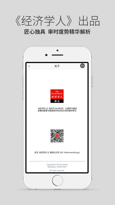 《经济学人・商论》 《经济学人》出品 《经济学人・商论》是经济学人报纸有限公司旗下众多国际新闻及商业刊物中的首款中英双语电子APP,萃取《经济学人》在商业、金融、科技等领域的精华文章,为中国读者呈现全球视角的深度分析,并鼓励中国的读者批判性地思考中国和全球重大议题。 创刊174年的《经济学人》,是世界上历史最悠久的杂志之一,也堪称全球最具影响力的媒体。这本政经杂志的忠实读者包括政商学界的决策者、企业家、各界精英人士等拥有巨大影响力的人群。通过智能手机及平板电脑,以及《经济学人·商论》中英双语APP直观而具吸引力的用户界面, 您可以阅读由《经济学人》编辑每月从周刊中挑选及翻译的文章。它们涵盖商业、金融、科技,分析全球商界走向,提供深度观察和犀利观点,这是《经济学人》已经开始为全球读者所领略的特色。 简介 • 中英语及繁简字体转换任您选择 • 精选商业、金融及科技文章,专业翻译,原汁原味呈现 • 每月一日发表10篇精选文章,每个工作日持续更新,每月共发布约30余篇 • 非订阅用户也可每月免费阅读3篇专题文章,以及每周同步推出的1篇免费文章和样刊 产品功能: • 《经济学人・商论》APP可免费下载 • 支持微信登录,方便管理订阅 • 每月30篇文章,每个工作日更新 • 可保存近一年内的文章,方便离线阅读 • 一键切换,轻易翻译英语及繁简中文 • 双击取词,支持点选或任意段落翻译 订阅选项: • CN ¥98.00 / 三个月 (GBP £16.49 / USD $16.99 / EUR €18.99 / HK $128.00 / TW $520.00 / SG $23.98 / CN ¥118.00) • CN ¥388.00 / 一年 (GBP £44.99 / USD $74.98 / EUR €59.99 / HK $448.00 / TW $1,790.00 / SG $94.98) • 您将按照iTunes定义的当前汇率以您的本地货币支付相应费用。 • 付款将在您确认购买时向您的iTune账户收取。 • 您在有效的订阅期内不允许取消当前订阅。 • 除非您在订阅邮箱期结束前至少24小时关闭自动续订,否则您的订阅到期后将会自动续订。 • 您的账号将会在订阅有效期到期前24小时内以购买时的价格为您自动续订。 • 您可以在您的iTunes账户设置中管理您的订阅和自动续订。 • 您可以通过您的iTunes帐户的订阅设置在免费试用期内取消订阅。这必须在订阅期结束前24小时完成,以免被收取费用。有关详细信息,请访问 http://support.apple.com/kb/ht4098 for more information • 您可以通过“帐户设置”关闭自己的订阅自动续订。但是,您无法在活动期间取消当前订阅。 • 完整的使用条款可以在http://www.economist.com/legal/terms-of-use中查看。 • 我们的隐私政策可在以下网址找到http://www.economistgroup.com/results_and_governance/governance/privacy/index.html 【更新内容】 2.0版本新功能: 界面全新改版设计,修复闪退问题,助您更轻松地获取全球商业、金融、及科技领域精彩评析洞见。 现在,您可以: -微信登录,更好管理订阅 -收藏 & 点赞 您喜欢的文章 - 阅读“已存档期刊” - 调整文章字体大小 - 切换日间/夜间阅读功能