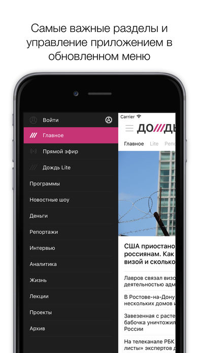 Смотрите прямой эфир телеканала Дождь, все выпуски программ, а также следите за последними новостями в приложении телеканала Дождь. Политические новости, новости бизнеса, культуры, науки, аналитика, интервью с ньюсмейкерами, определяющими повестку дня – все это вы найдете в приложении телеканала. Опции, доступные в приложении • Уведомления о важных новостях • Поиск по всем материалам Дождя • Фотогалереи • Возможность скачивания видео для просмотра в офлайне • Привязка аккаунта на смарт-телевизорах • Активация подарочного кода • Лента новостей • Прямой эфир в видео и аудио вариантах • Авторские программы Ксении Собчак, Натальи Синдеевой, Павла Лобкова и других наших авторов в видео и аудио вариантах • Журналистские расследования, видео и фото репортажи • Поддержка трансляции на телевизоры с помощью AirPlay Приложение доступно к скачиванию бесплатно, для доступа к прямому эфиру и некоторым авторским программам в архиве необходима подписка. Вы можете* получить доступ ко всему контенту бесплатно на 7 дней, и после этого принять решение о подписке. Подписка, приобретенная в приложении, дает доступ к материалам телеканала Дождь на всех устройствах – в других приложениях, на смарт-телевизорах и на сайте. После оплаты не забудьте зарегистрироваться, чтобы доступ стал возможен на всех платформах. Стоимость подписки 1 месяц полного доступа ко всему контенту на всех устройствах – 459 рублей 1 год полного доступа ко всему контенту на всех устройствах – 4790 рублей Подписка будет автоматически продлеваться по истечению оплаты. Деньги будут сниматься с вашего аккаунта в Itunes, с карты, привязанной к нему. Если вы хотите отказаться от подписки, сделать это можно всегда в настройках учетной записи Apple ID в Itunes. Телефон нашей службы поддержки +7 (495) 744-03-83. Техподдержка работает по будним дням с 12 до 21 часов по московскому времени. В остальное время вы можете писать нам по электронной почте на web@tvrain.ru *Предложение о промоподписке действительно один раз для каждого пользователя Сайт телеканала Дождь http://tvrain.ru Ссылка на офферту https://tvrain.ru/oferta/