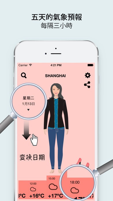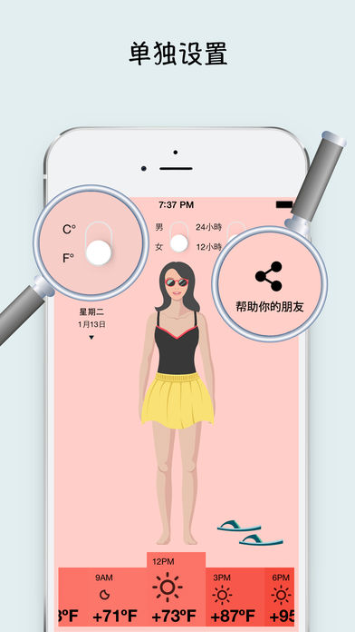 最好的天气运用程序能够显示在地球上任何地方、具体的时间应该穿着什么。 不可或缺的信息为那些谁: - 向朋友通知戶外的天气信息 - 看是晴天,实际上很冷 - 早晨匆忙起床,脑海里浮现着如何着装的方案 - 不知道怎样着装去旅行或出差 - 应该经常考虑男士、女士、男朋友、女朋友应该怎样着装 - 了解时间花在哪里,我们的软件节省时间 需要考虑几点因素: - 温度 - 湿度 - 风力 选择位置的两种方式: - 依靠导航的帮助 - 手工服务 时间指标: - 五天內的气象图 - 三小时间隔 选择人事的可能性: - 男性 - 女性 补充设置: - 二十四时计时与十二时计时法 - 摄氏与华氏温度表盘 优势: - 缺乏类似的软件 - 气象数据的实际应用 - 简单直观的界面 - 简要设计,全部焦点在服装上 - 应用程序总共七兆,不需要占大量内存空间 - 气象数据的可靠性与准确性