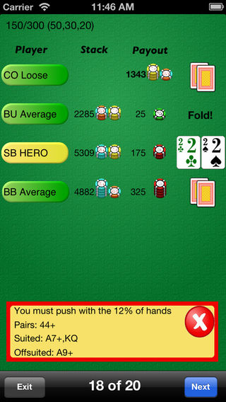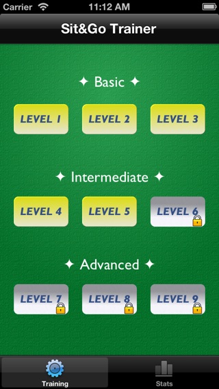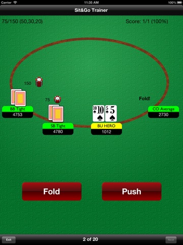 Improve your results in the most important phase of any Sit and Go Tournament using Sit&Go Trainer - Thousands of real situations will put you to the test and help you to improve at the critical point of the tournament - Use learning-by-doing to improve your game in the late phase of tournaments - Get a feel for playing using the ICM model - 9 levels, from beginner to advanced Sit&Go Trainer will guide you through the late phase of a Sit & Go tournament (the push or fold phase). You will be given a particular in-game situation and can decide whether you want to push (bet all your chips) or fold. You begin with the first lesson. Once you have successfully completed it, you'll be able to move on to the next one. Once a lesson begins, you'll have to decide for every hand, whether you want to push (bet all your chips) or fold (give up your hand). These are the only two possible responses. Once you have made your decision your response will be evaluated as right or wrong. You will also learn which cards you would have played exactly the same in a similar situation. Levels 1-3 . Play against average players. 4-6 . Play against random players (average, tight or loose) in intermediate-difficult situations 7-9. Play against random players (average,very tight, tight, loose or very loose) in complicated situations Analyze your statistics at each level. Important: Remember! Don’t play before completing the Sit&Go Trainer or you will lose your money!