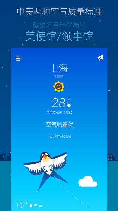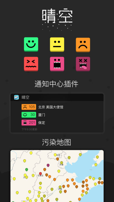 晴空+是一款简洁漂亮的空气质量和天气查看工具,支持全国460+县市和2200+监测站点。 虽然空气中时有雾霾,但我希望这款有爱的 APP 可以清除您心中的雾霾,带来愉悦! iPhone/iPad 版: - 用精心绘制的主题图画直观表述空气质量情况,同时拥有白天和夜晚主题 - 空气质量报告每小时更新,同步全国各省市环境监测站,数据来自全国2200多监测站点 - 北京、上海、广州、沈阳、成都5个城市支持美国大使馆/领事馆AQI和PM2.5测量数据 - 通知中心插件,可快速查看关注城市的空气质量 - 天气状况和未来3天天气预报,数据来自中央气象局 - 可以把关注的站点添加到首页 - 可选择站点计算平均空气质量 - 同时拥有中美两国标准指数,根据国内监测站测量的污染物浓度计算出美国标准指数 - 拍照测雾霾功能,可显示拍照点的空气质量,并且可以添加哥斯拉、UFO等好玩的东东 - 没有广告! Apple Watch 版: - 有趣的空气表情动画和天气动画(目前暂时只有雨天动画) - 表盘组件上显示空气表情 晴空的诞生: 作者 WL 在 App Store 找不到一只令人满意的空气质量和天气 APP,只好决定亲自做一个,于是就有了晴空。 媒体报道: 36Kr【氪TV视频】4月第1周最棒的5个APP http://36kr.com/p/531473.html ● 对于部分手机升级到iOS10后弹不出“允许app使用数据”弹窗的问题,重启下手机就可以了。 如果您在使用中遇到任何问题请使用下面的方式联络我: 晴空网站:http://wzpo.net