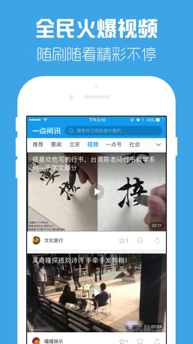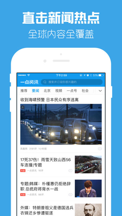 一点资讯是一款专业的手机新闻阅读软件。 我们致力于打造及时、专业、权威、为用户着想的新闻资讯App。 凭借技术优势,每日精选了娱乐、财经、体育、社会、汽车、军事、房产、健康等诸多新闻内容,全面覆盖热点领域,每日更新上万条数据。 智能分析用户爱好,精准推荐你真正感兴趣的资讯内容! ———————专业频道定制—————— 时政新闻、财经资讯、社会热点、军事报道、 娱乐八卦、时尚潮流、运动健康、生活百科、 家装设计、育儿常识、星座命理、出游旅行、 野史探秘、太空探索、未解之谜、前沿科技... 订制你感兴趣的资讯,探索你未知的新世界! 你可以获取时事动态,关注经济走势;还可以订阅行业知识充电学习;亦可以了解野史秘闻、探秘未解之谜! 搜索你感兴趣的内容,订阅你的专属频道,独创兴趣引擎智能分析你的爱好,为你呈现真正感兴趣的内容! 2015年最火的资讯类应用,千万用户的共同选择! ———————来自用户的认可——————— “每天上下班地铁上都用一点资讯阅读离线文章,非常方便,再也不用担心信号的问题了!”---by 泽鹏85 “一点资讯的内容很丰富,各行各业都有,我的手机图书馆的感觉!好文章一键收藏!感谢一点资讯的开发者们。” ---by 蕾蕾花开 “没事的时候在这里翻翻新闻,看看外面的动静。字可以调的很大,眼睛不累,现在平板上也有了,很不错!” ---by 石兰山下 “感谢一点资讯,从怀孕到生完一直在看,各种各样的怀孕要注意的事项,带孩子的细节,总能让我学到新知识!”---by 兜兜她妈 “在一点上学习到了很多养生食谱,不仅美味,还能给老人、孩子更丰富的营养,没事我都会打开看看,一直给我推荐,特别方便”---by hua123 “和喜欢欧巴的人一起订了频道,欧巴的所有消息都能第一时间收到,喜欢欧巴的看过来,让欧巴订阅数上十万!” ---by ilovedachui “在很多地方都有更新自己的文章,一点这边给我的感觉是不浮躁,认真的文字给认真的人看,这种感觉很好,感谢一点资讯。”---by 大师笔记 ————————————————————— 感谢所有支持一点资讯的朋友们,你们的五星好评、真挚留言是我们前进的最大动力! 如果你还有其他的想法,请让我们知道: 微博:@一点资讯 微信公众平台:yidianzixun2013 官方网站:www.yidianzixun.com 媒体平台:www.yidianzixun.com/mp 商务合作:bd@yidian-inc.com 用户反馈:feedback@yidian-inc.com