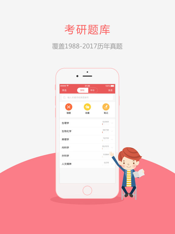 本题库内容源自医教园出版物《西医综合真题考点还原与答案解析》,包含1988年至2017年专硕、学硕全部真题,为市面上题量最大,答案解析最详细,功能最强的西医综合真题题库! 本题库包括离线答题、离线搜索、考前模拟测试、考后估分、按年份筛选答题、在线评论、我的错题、我的收藏、圈子等十大功能模块。 1.离线答题 离线答题为本题库的核心功能,在用户每网络的情况下可以进行练习,退出登录的时候自动会同步答题记录 2.离线搜索 离线搜索可以在无网络的情况下根据“真题编号”或“关键词“搜索真题 3. 考前模拟测试根据实际考试的难度出的180道模拟练习题,医教园会不定时的举行线上万人模拟测试 4. 在线估分系统很方便的提供给考生在考试结束之后我们会第一时间展示出2016年的最新考研真题方便大家对自己的考试成绩进行评估 5.在线评论 在线评论将每一道真题作为一个独立的主题展开讨论,所有关于该真题的疑难问题都可以通过讨论解决 6.我的错题 我的错题可以按年份划分也可以按章节划分,记录了所有做错的真题,以方便重温做错的真题。我的错题与做题记录关联,清空做题记录时我的错题也将同时被清空 7.我的收藏 我的收藏记录了所有收藏的真题,对需要重点复习的真题可进行收藏,收藏不受清空做题记录影响 8.圈子功能的加入为同学们提供了一个互相交流展示才艺的一个平台,里边可以发表讨论帖,学术贴,等 关于本题库的建议或使用问题可加QQ群483127162,257768321进行讨论,或进入本软件“个人中心-设置-意见反馈”进行反馈。感谢您对本题库的支持!