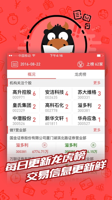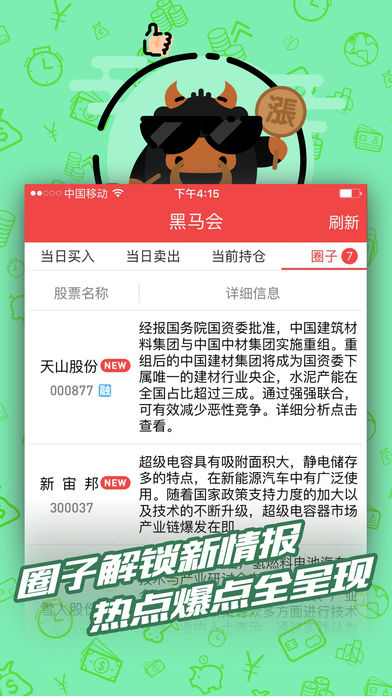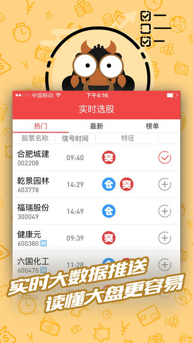 【买卖时机简介】 买卖时机,开启股票交易大数据时代! 【盯盘无忧 一劳永逸】:买卖时机基于先进的大数据技术,在众多炒股软件中脱颖而出。简单、易用、专业,实时刷新并推送股票交易信号,助你随时随地轻松把握行情、紧抓交易时机、做出科学决策。 【交易指标 一目了然】:“专业版”解锁所有「突」「仓」「空」「BS点」「量能」信号指标,高峰时可提前3-5分钟获得实时推送。「仓」表示正在建仓,可密切关注,在「突」信号的时候可考虑买入。K线(日线级别)中的交易指标只需根据提示在「B」点买入、「S」点卖出。同时更多推荐最新、热门选股,终身使用。 【轻松选股 一马当先】:“黑马会”基于人工智能大数据模型,拥有独享的推送服务器,只需根据机器人实时提示买入及卖出,零延时,拒绝拥挤,跟单简便。“待涨股”基于大数据技术分析并推荐具备上涨趋势的强力股,节省99%选股时间。 【权威资讯 一手掌握】:“圈子”解锁一手行业情报,实时推送企业内部消息,同时自动抓取金融财经新闻,热点、爆点轻松掌握,助你把控选股方向、抢占投资先机,是菜鸟进阶到牛人的炒股必备神器。 股市变幻莫测 时机唾手可得! 券商内参 股民必备 买卖时机助你一臂之力! 官方微信:maimaishiji