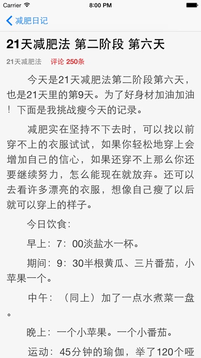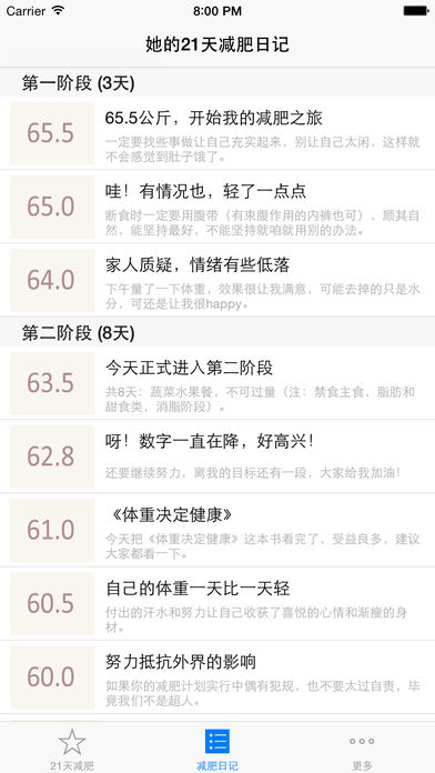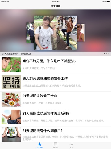 有数据研究证明,养成一个新的习惯需要21天,21天减肥法就是利用这21天时间,把胃饿小并且改变一个人的饮食习惯,这样才可以彻底远离肥胖。21天减肥法适合身体体质较强壮者,如果患有肠胃疾病体质较弱者请绕道。 全程21天减肥法,分为三个阶段 第一阶段 前3天:断食疗法(注:完全禁食,只饮水,排毒阶段,可以用蜂蜜水)。 第二阶段 中8天:蔬菜水果餐,不可过量(注:禁食主食,脂肪和甜食类,消脂阶段)。 第三阶段 后10天:可正常饮食(注:饭量是6成饱,睡觉前5小时不进任何食物)。 严格执行21天后一般减少体重15斤左右,如果提前达到理想体重可以提前结束,减肥成功以后一定注意不要暴饮暴食,以免造成反弹。 看着好多姐妹都在21天,看着断食什么的就觉得很痛苦哦,现在还在进行中的姐妹们,给你们打打气,相信坚持下去,效果真的会非常显著。 营养师有话说:这个计划包括了营养均衡的膳食,规律的运动,同时强调了日常生活的行为改变。通过21天饮食运动的调整,形成一个健康的生活习惯,你收获的不仅是体重方面的变化,更是让你一辈子受益的健康的生活方式。