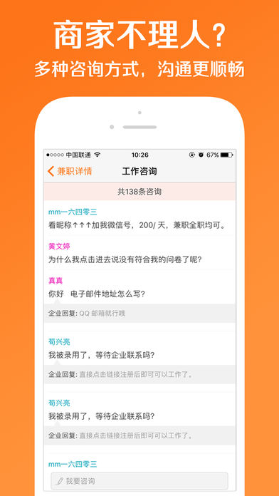 应用介绍: 兼职,是一种新的职业生活方式! 兼职猫,一款真实可靠的找兼职平台,多元化的赚钱方式将丰富着你的生活! 想兼职,没保障,兼职猫六个措施全面保障用户权益。 排队,等人,时间太零碎,玩转喵任务,时间可变现。 无聊,迷茫,缺乏职业规划,来A猫学堂,学习原来如此有趣。 世界那么大,钱包那么小,选兼职旅行,邂逅美好青春 【让钱包鼓起来-短期兼职】 购物要分期,教育要贷款 兼职一样可以让钱包鼓起来 学习强当家教,颜值高可以当模特 总有一款兼职适合你。 【这里N多签约名企-精岗专享】 大三找实习,应届生求职找工作 想进大型企业,不了解招聘要求 万家名企直签,求职更有保障 【应用试客可赚钱-喵任务】 想赚钱,却没时间 你只需要一个手机 体验几款应用,或填写一下问卷 赏金立马到账,支持提现。 【跟谁学-A猫学堂】 学习太无聊,未来太迷茫 学习能手,职场巨擘与你面对面 职场教育,0距离沟通 规划属于自己的未来。 更多功能请打开兼职猫 海量兼职,限时提价 优惠福利,任君挑选 兼职猫已拥有千万级别的忠实用户,我们希望打造一个全民兼职的时代!快快加入我们吧,一起来创造一个“斜杠青年”的时代吧! — 联系和反馈 — 对于产品如有任何疑问和建议,请联系我们 客服QQ:800005602 客服电话:4008034199 官网:http://www.jianzhimao.com