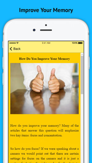 Improve Your Memory is a app that includes some very helpful Information for How Do You Improve Your Memory by Changing Your Behaviour!! Improve Your Memory includes How Do You Improve Your Memory Use an Improve Your Memory Quiz How to Fight the Signs of Aging How to Improve Your Memory for…
