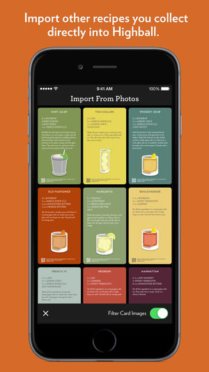 Highball is for collecting and sharing cocktail recipes. Choose the ingredients, description, and custom drink image for each recipe. Share as a beautiful "drink recipe card" on your favorite social network. When you save and import a drink recipe card image, it becomes fully editable.